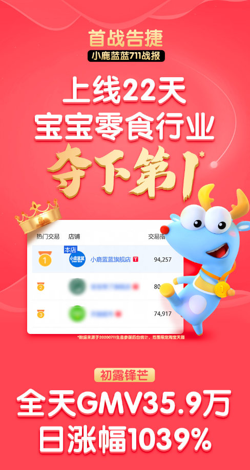 今年4月,三只松鼠对外宣称创立四大新品牌,涉及婴童食品、宠物用品、喜礼、快食品等品类。6月19日公司成立8周年当天,婴童食品品牌小鹿蓝蓝率先上线,22天便夺得宝宝零食行业第一。热卖仍在继续,712活动当天,小鹿蓝蓝(母婴食品)首次直播亮相,奶酪、海苔、饼干、溶豆等热门品类受到消费者热捧,当日销量3.5万元。