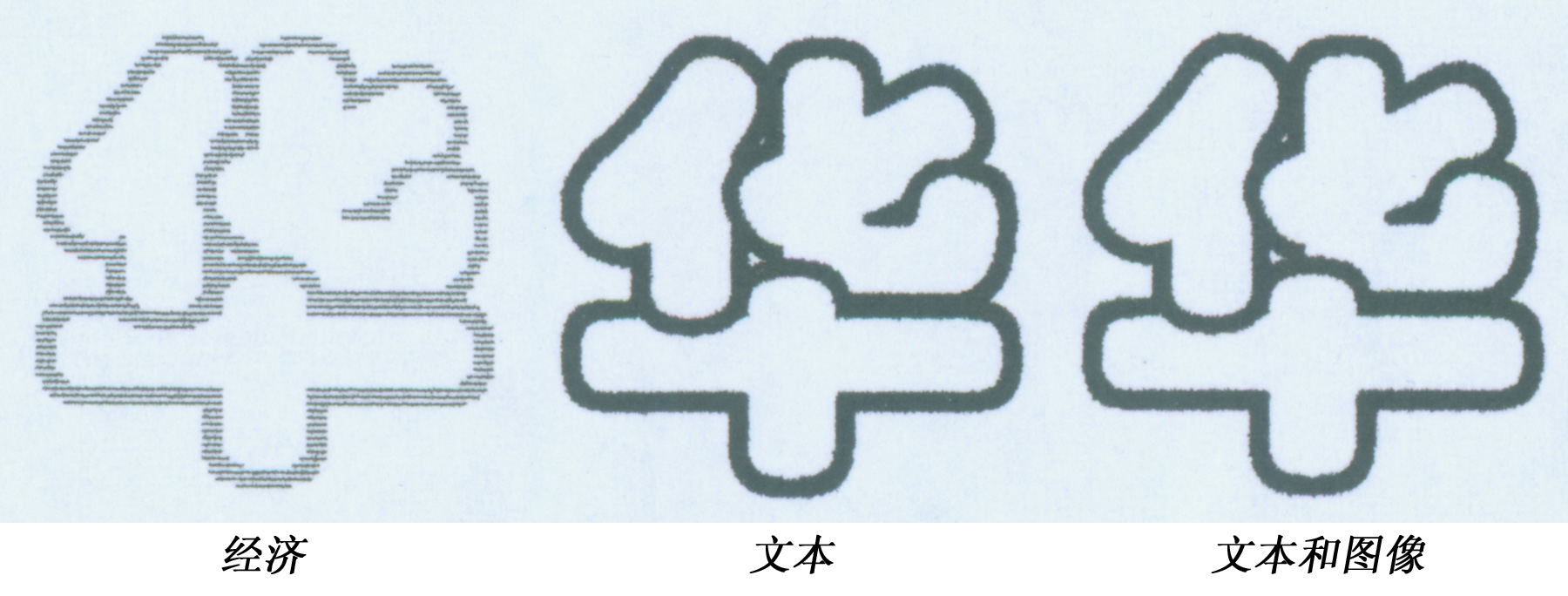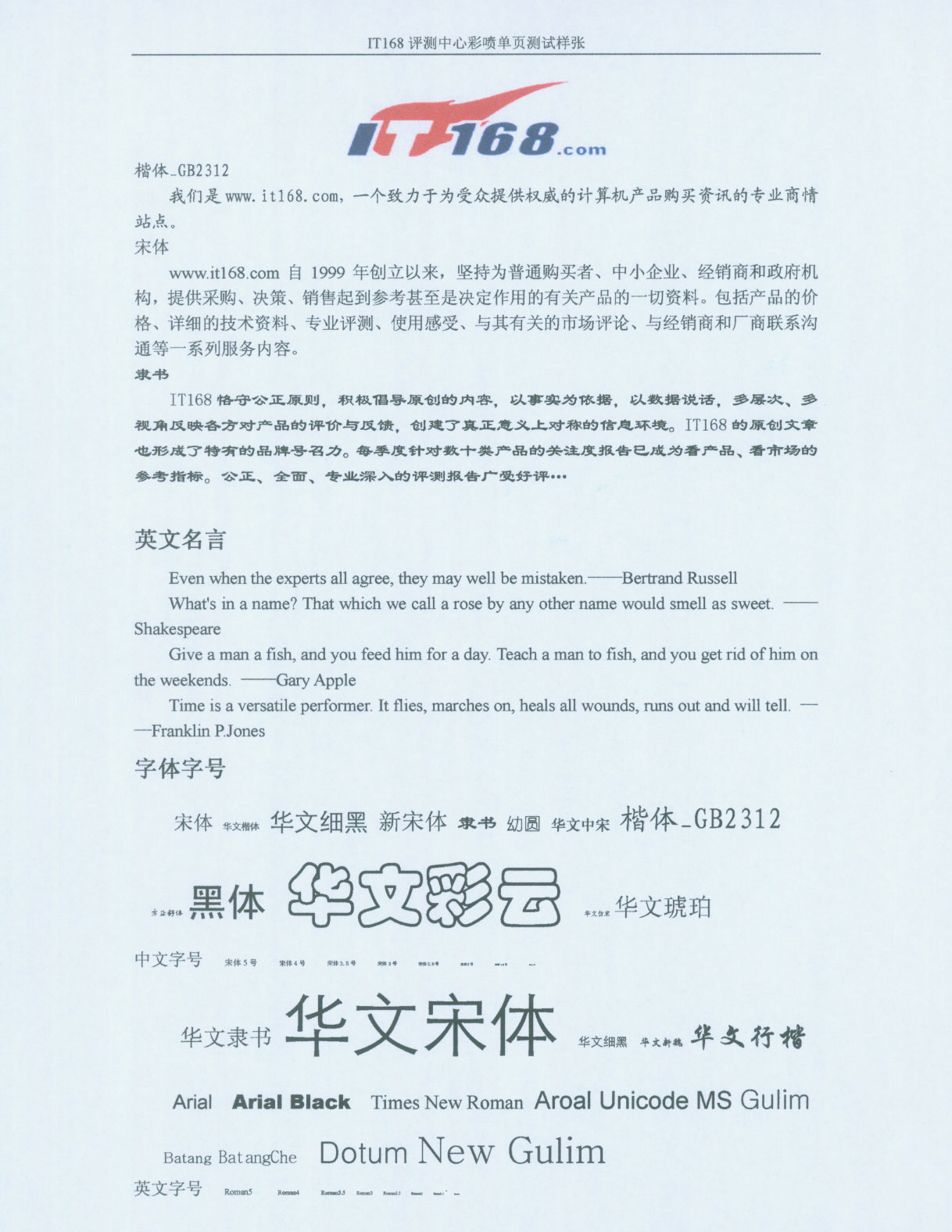 喷墨打印机的打印速度和打印质量密切相关,经济模式的打印速度比文本模式高出很多,代价就是打印质量的下降。这种下降不可避免,但是如何能够缩小这种差距对于商用喷墨打印机是一个很重要的问题。华文彩云字体中,边缘有一定的毛刺现象;华文楷体字体表现中,边缘有轻微的墨滴扩散,整个字体着墨比较均匀。文本样张整体黑度充足,字迹清晰锐利。