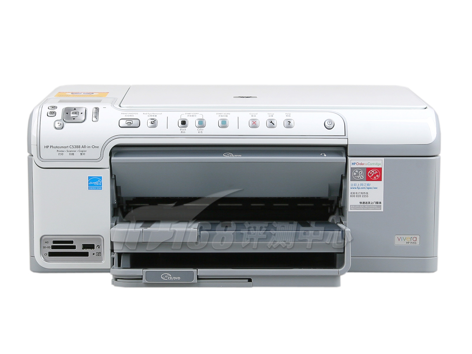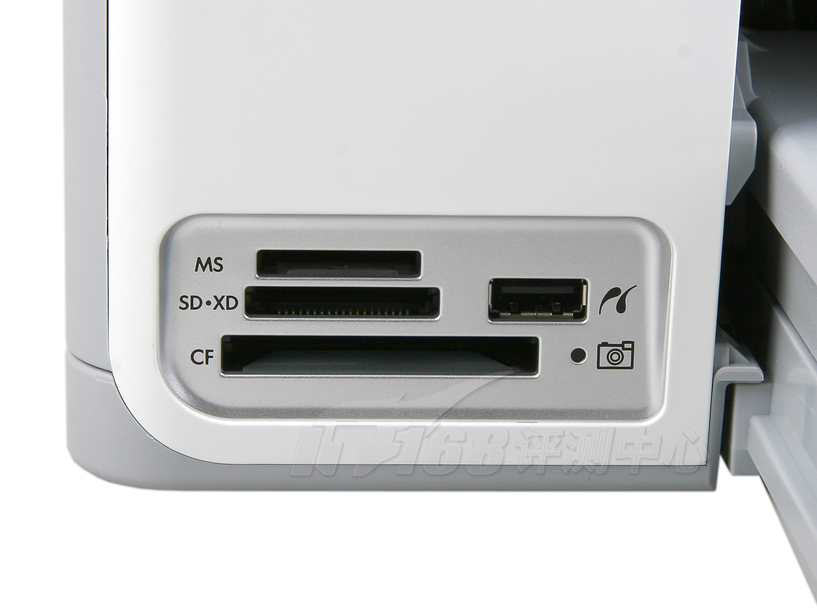 从外观上看,惠普C5388和单功能打印机的设计风格相似,纸张采用底部进纸、底部出纸的U型走纸通路,这都符合惠普一贯的设计风格。C5388的背面和侧面是灰色,正面是珍珠白钢琴漆,边角都是圆弧型设计,避免打印机与其它物件碰撞,整体设计风格在文中的基础上透出时尚。机身正面的左下角有读卡器,支持MS/SD/XD/CF的存储卡格式,同时支持PictBridge接口并且可以直接连接相机,降低在照片打印时对于PC机的依赖。