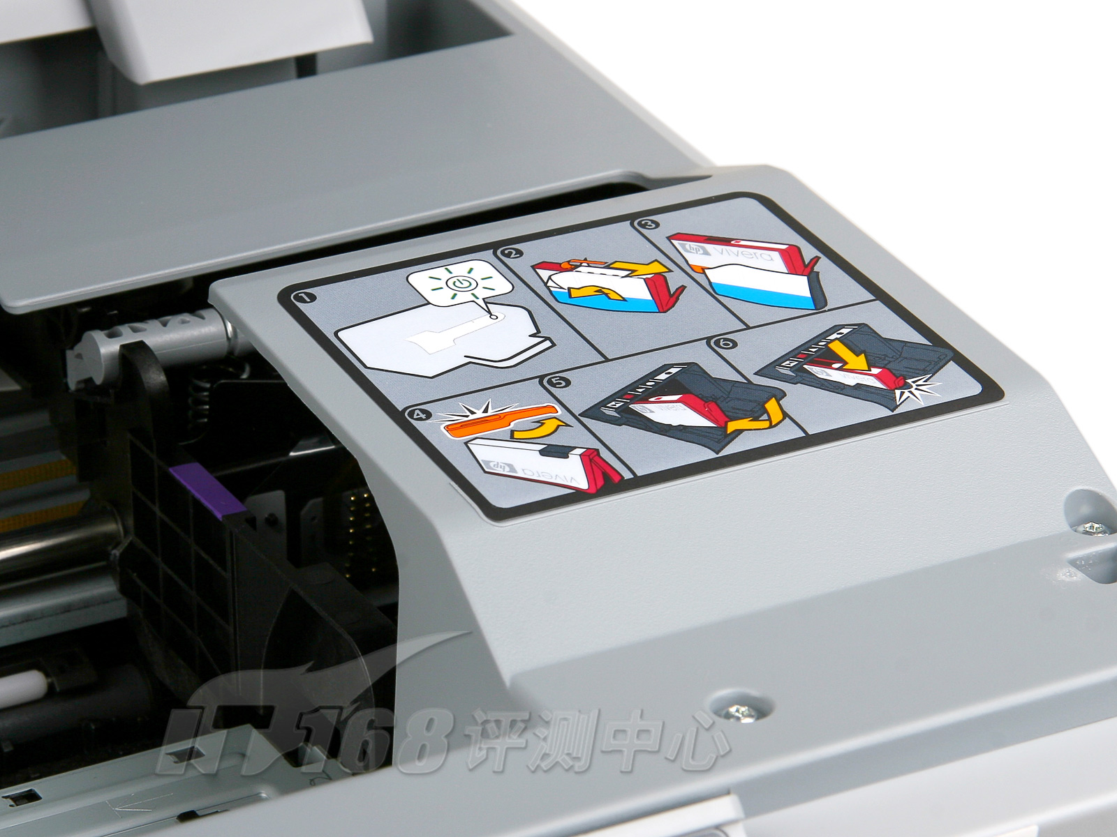 在文章的开始,我们已经用大篇的篇幅介绍惠普的五色墨水系统,而对用户来说,一个全新的体验是要用户自己分别安装打印头和墨盒了。在以往的惠普喷墨打印机或者一体机中,往往不需要独立的安装打印头和墨盒——要么是安装头水一体式墨盒,SPT打印机一般只安装墨盒就可以了。C5388需要用户自己安装打印头和墨盒,打印头设计成独立的舱室,可以同时容纳墨盒。安装打印头的时候只需要将打印头放在固定的位置卡紧就可以,安装过程很简单,不会像L7380那样容易损坏。