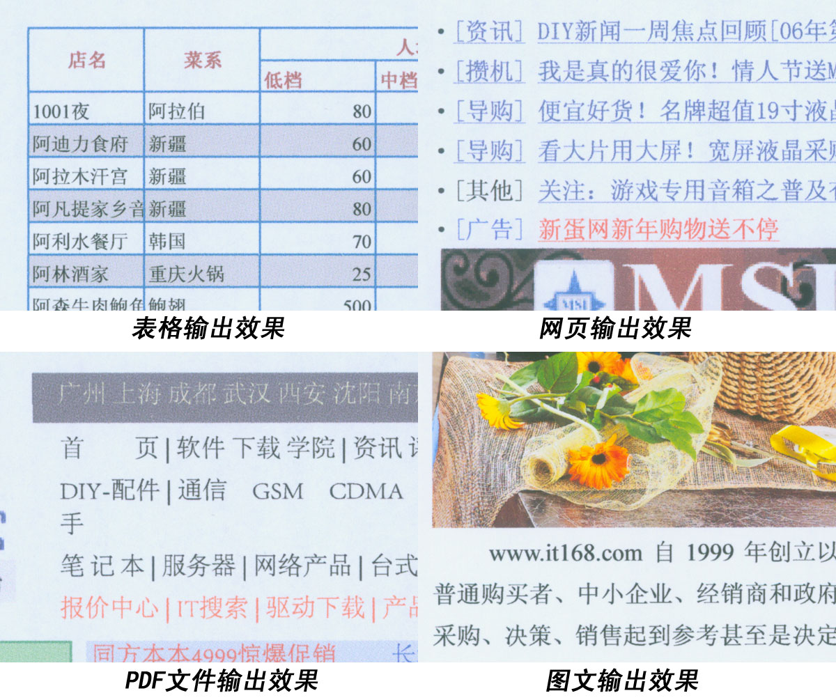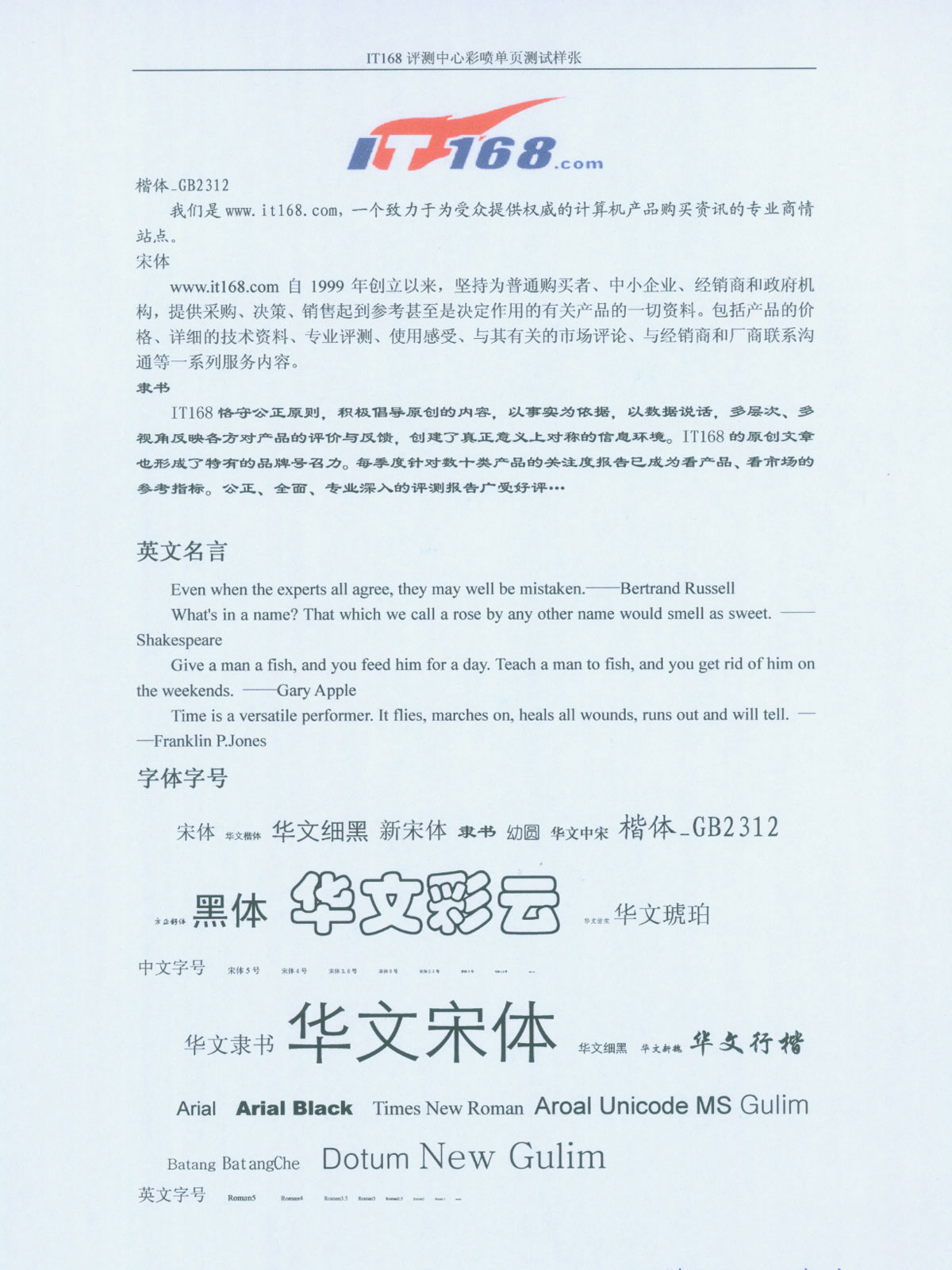 从文本输出样张来看,字体清晰锐利,黑度充足,最小字体可清晰辨识到1.5号字,没有任何的笔画丢失和粘连,这是完全可以和激光打印机相媲美的文本输出效果。在华文彩云的打印效果中,边缘圆润平滑,只有在放大后才会观察到边角的一些轻微毛刺;而在楷体的显示效果上,尖角勾画清晰锐利。