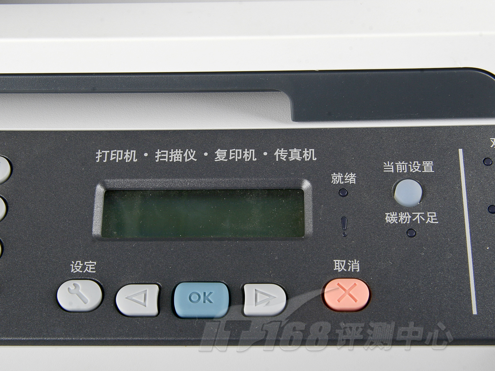 【IT168评测中心观点】简易的装订装置是M2727nfs的亮点,而同时,我们看到更多的是M2727nfs在人性化和易用性方面的出色表现。首先是中文液晶屏显示屏,从液晶屏的面积和操控性我们可以感觉到M2727nfs还是注重控制成本的,做为中端机型,并不在这些方面和低端机型拉开差距。但是,液晶屏支持中文显示,这对于用户来说很重要,M1522系列以及更加低端的M1120都不支持中文显示。同时,M2727nfs拥有同系列的另一款机型M2727nf,差距在于一个扩展的纸盒,用户可以根据自己的实际需要来选择是否需要扩展纸盒,两款机型有具有很高的实用性。