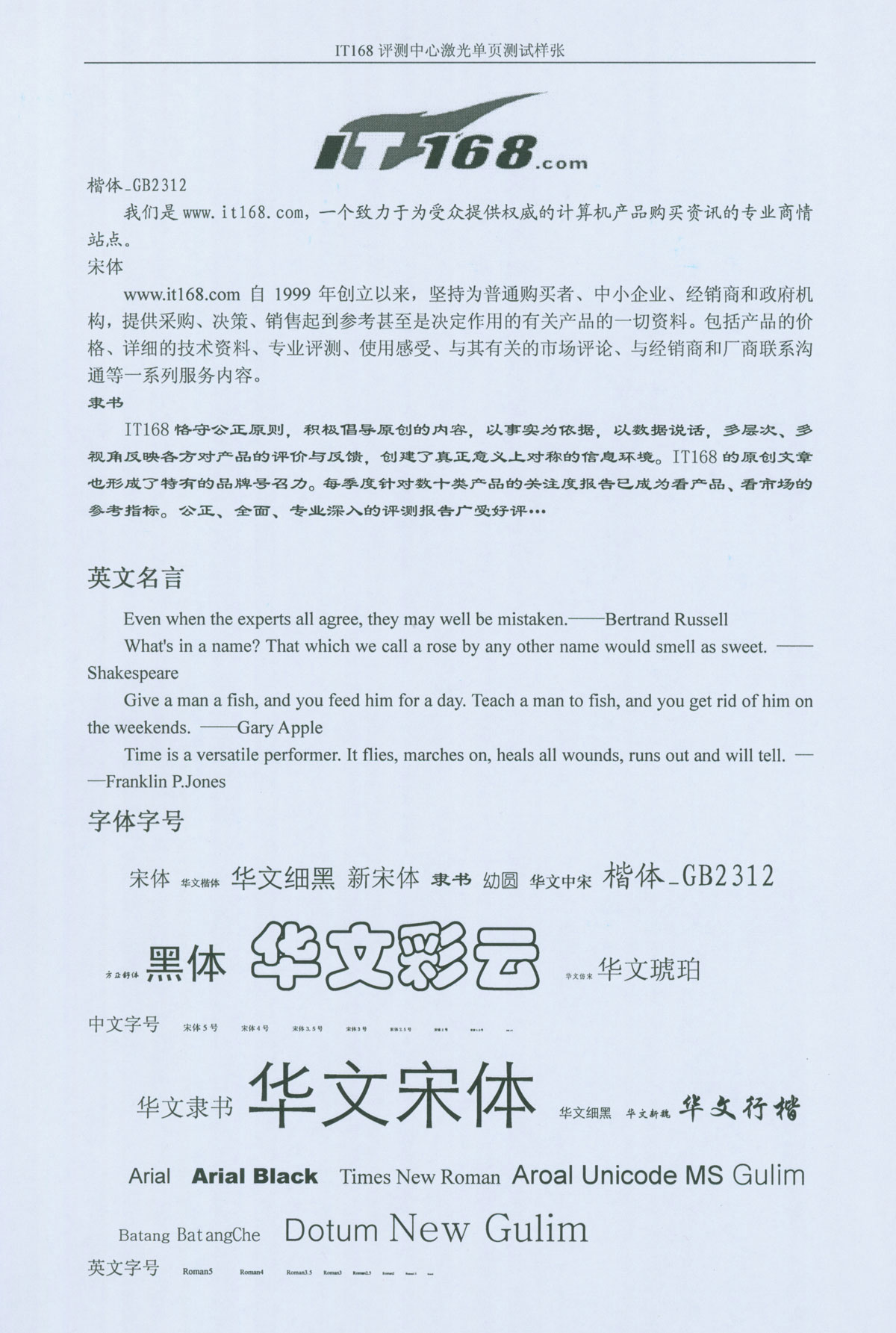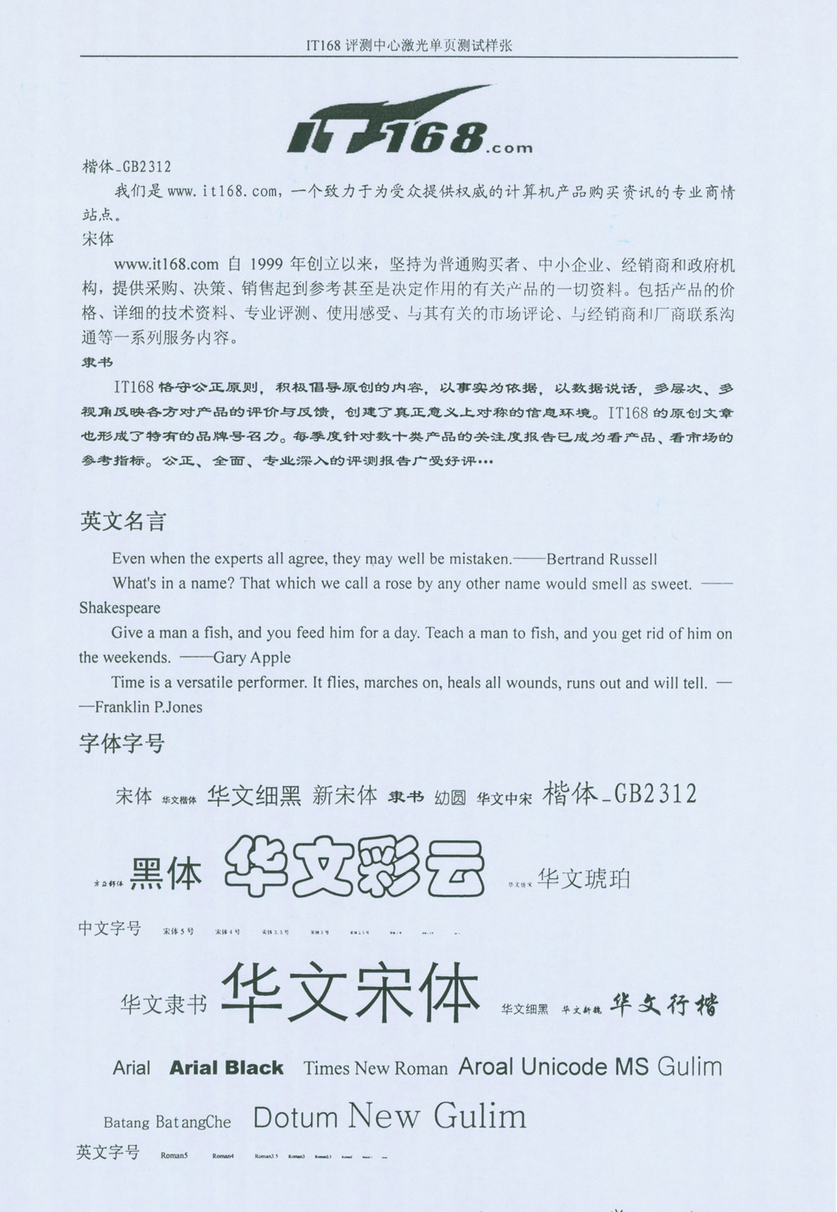 惠普M2727nfs文本输出的黑度表现非常充分,文本样张字迹清晰锐利,给人的视觉冲击力很强,但在黑度充足的同时,对于灰度的表现不够明显,因此不适合输出反向黑白和有底纹的文本输出。在默认模式下,小字体方面可以清晰识别到1.5号字体,没有任何的笔画丢失和断裂,华文彩云和华文行楷的字体表现上,字体边缘有轻微的碳粉飞溅现象,整体表现优异。