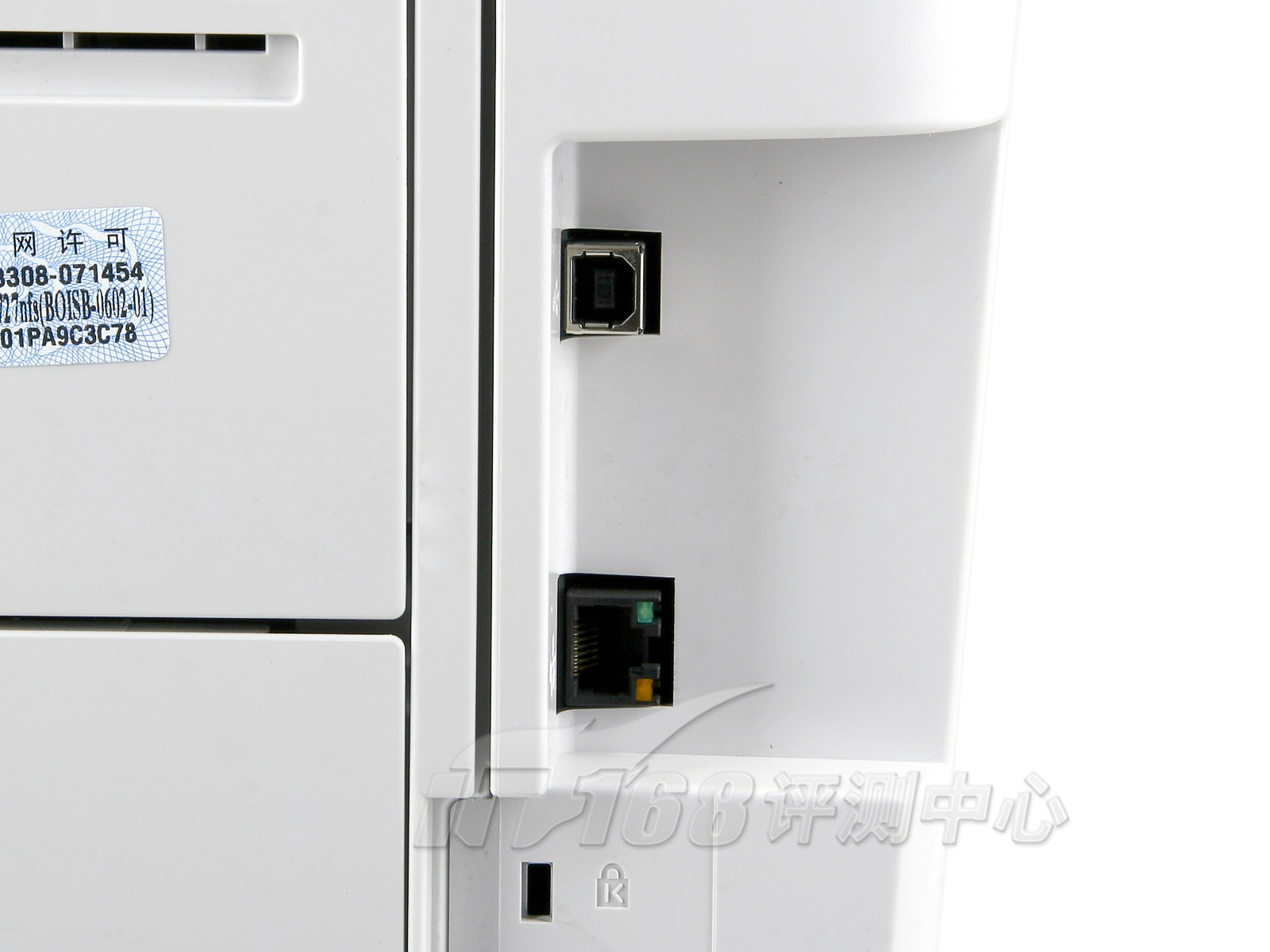 和惠普低端入门级黑白激光打印机和黑白激光一体机普遍存在的翻盖式进纸系统不同,M2727nfs采用全封闭式进纸盒。在低端单功能打印机中,在P1000系列中全部是采用翻盖纸盒,而在P2000的机型中才会使用封闭纸盒,可以看到这种设计方式会更加高端一些,也只有这种进纸盒才可以支持扩展。从外观上看,M2727nfs显得稳重,同时,由于在扫描单元两侧有支架,使得出纸仓的空间很充裕。接口方式提供USB和网络接口两种方式,集中在机身背部。