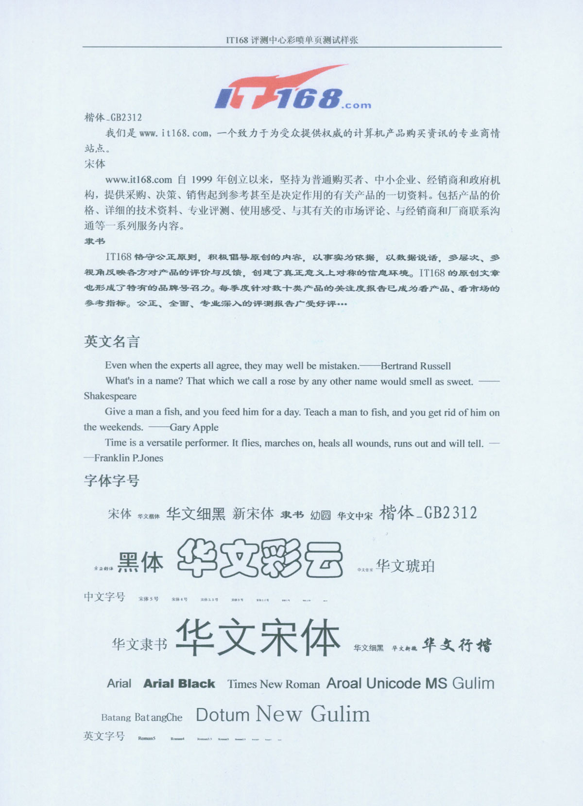 我们选取了文字覆盖率低、中、高的三张样张来评判传真机和喷墨一体机的传真速度和传真质量。同时,为了保证发送传真和接收传真的公平性,我们选择一台第三方的黑白激光多功能一体机HP M2727nfs和J3508以及KX-FP706CN分别进行对传,在此条件下,我们认为J3508和KX-FP706CN处于相同的发送和接收环境。样张1的文字较少,有简单图像和线条;样张2为覆盖率较高的纯文本文件,有简单的红色和蓝色在其中;样张3是复杂的图像,包括灰阶、反向黑白等等。