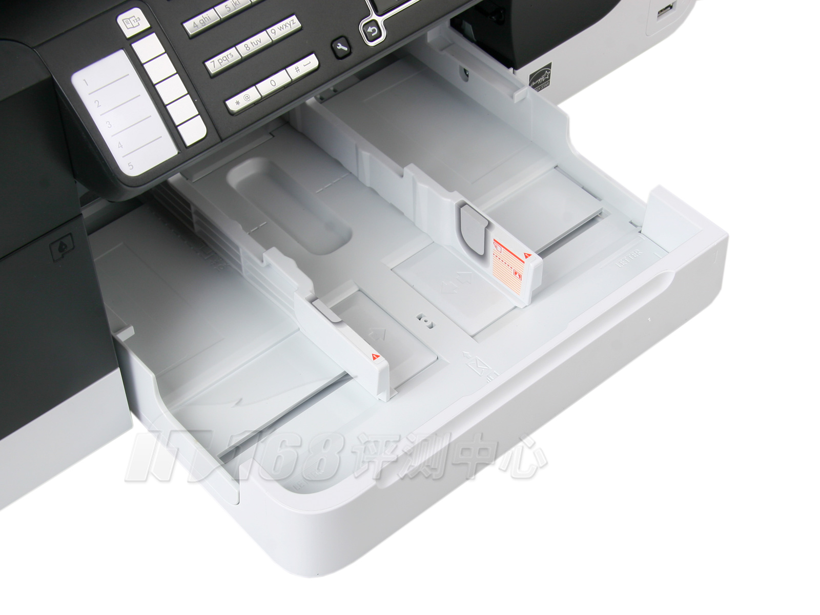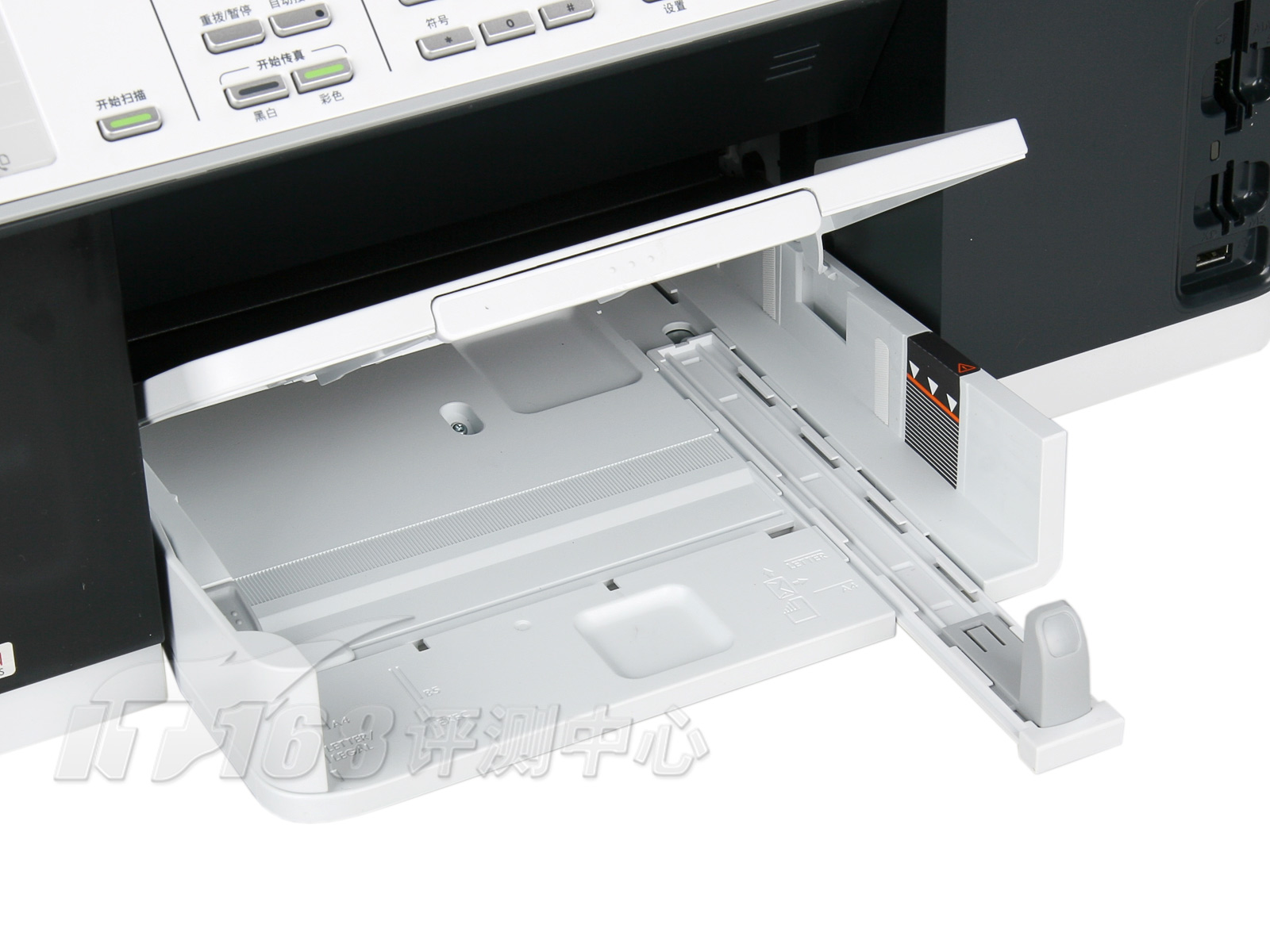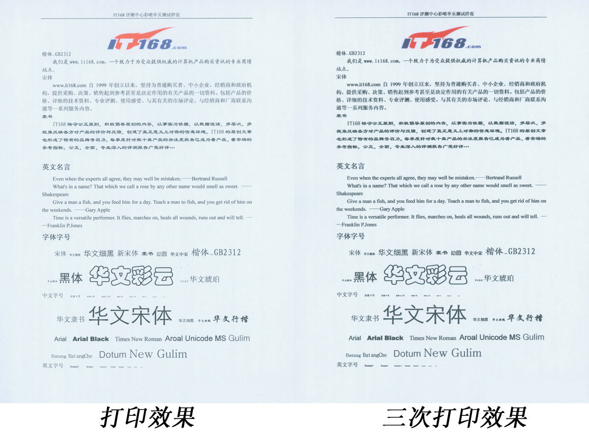 惠普新品pro8500和pro8000一个重要的改进是将进纸系统由原来的单向进纸卡夹固定位改为双向固定,这样可以将搓纸轮的位置固定完全居中,使得纸张在进纸时受力相对均匀,对于不同幅面不同类型的介质都可以保持良好的进纸精度。在我们对于两台新品的评测过程中看到,将同一份文本在同一张纸上打印3次,所得到的效果基本重叠,完全看不到重影现象。