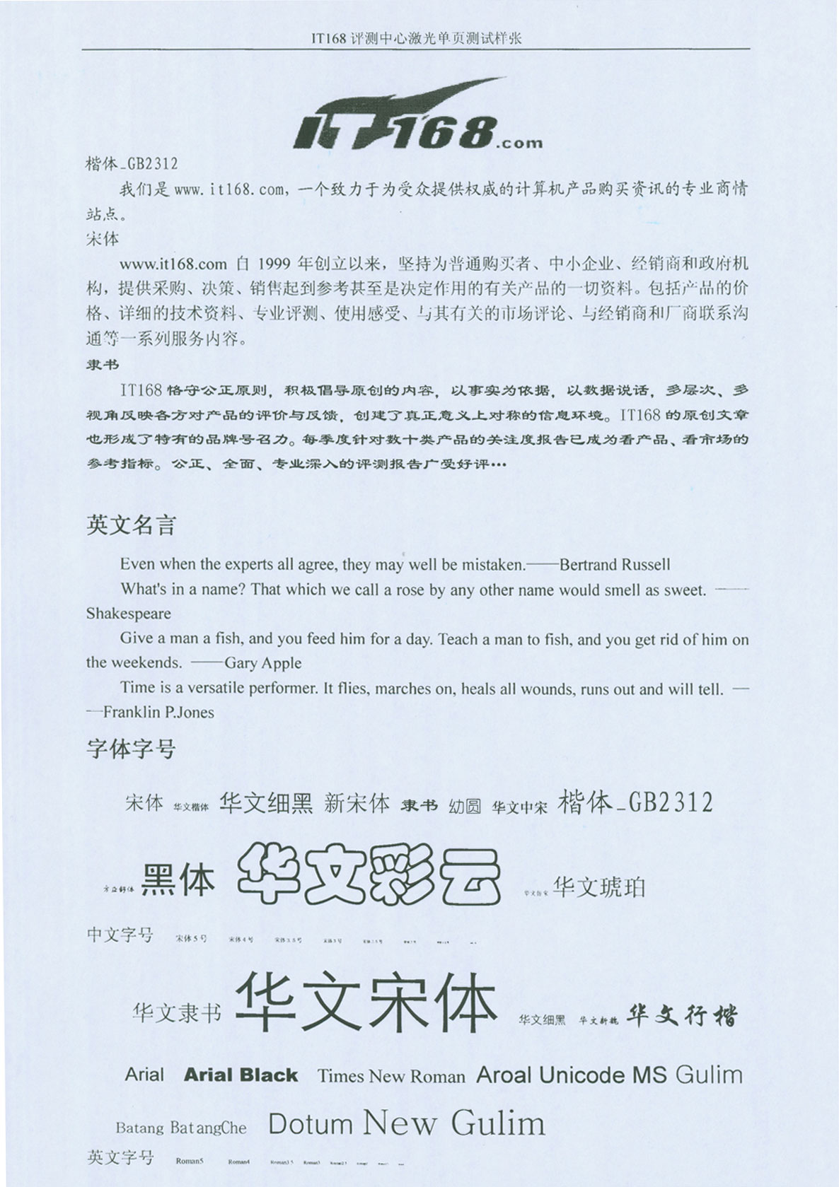 MFC-7840N的文本输出能力出色,从整体上看,样张字迹清晰有力,给人的视觉冲击力强劲。对于不同字体的表现,MFC-7840N可以清晰打印1.5号字体,笔画清晰,基本没有缺失和粘连的现象。在华文彩云的字体表现中,曲线之处圆润平滑,肉眼基本看不出毛刺和墨粉飞溅的现象。在华文楷体的字体表现中,墨迹填充均匀,笔画比较连贯。