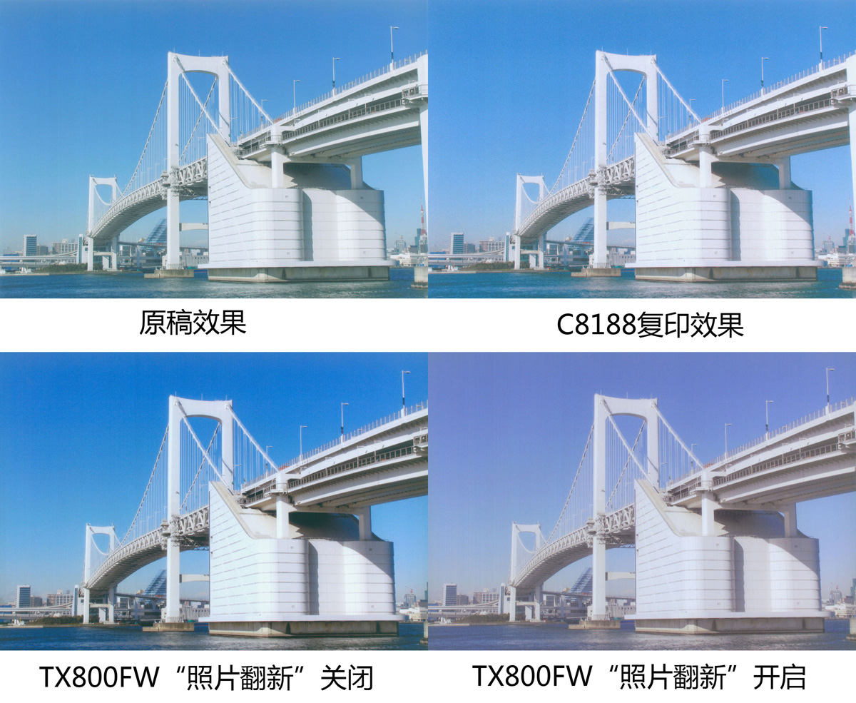 从复印速度上看,C8188的黑白复印和彩色复印比打印的首页输出速度均有一定的下降,扫描过程完成后的连续输出和打印基本持平,MP638的复印速度基本和打印速度保持同速。C8188复印效果对于原稿效果有一定的下降,主要表现在字体的黑度、边缘的毛刺以及色彩的准确性。从复印的整体效果看,圆滑度和连贯性稍逊于打印效果,另外镂空位置上有一定的细节丢失。TX800FW在文本复印方面,复印效果比较好的还原了原稿,同时在TX800FW复印的时候,实现真正的无边距复印,其它很多彩色喷墨一体机在复印时都会在不同位置丢失细节。在照片复印方面,两款机型都可以比较好的还原原稿细节,而TX800FW在卓越的照片打印能力和出色的扫描性能的基础上,推出“照片翻新”功能,照片复印时,有“色彩翻新”的选项,从效果上看,色彩艳丽程度和饱和度甚至超过了原稿。而照片复印的同时很好的保留了精度,大桥上的钢丝都可以细腻的表现出来,TX800FW是我见过的照片复印能力最出众的一体机。