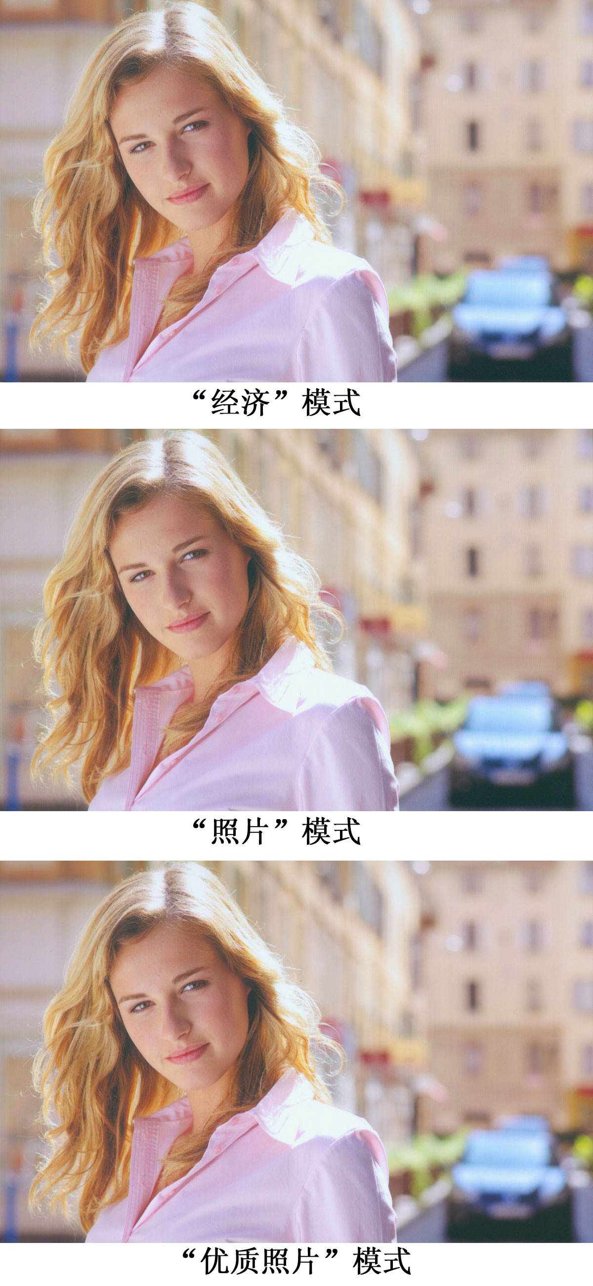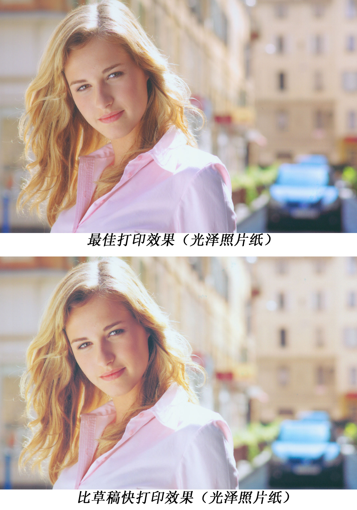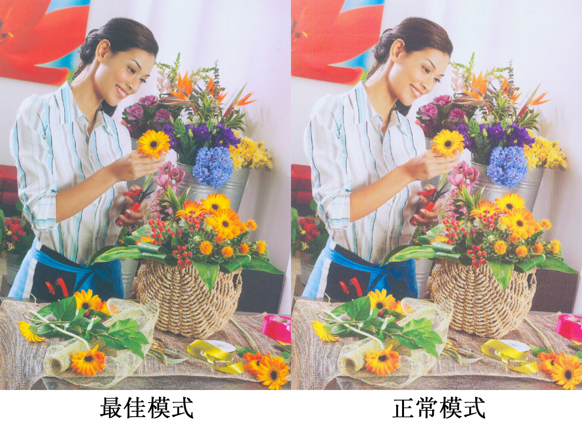 照片输出品质是考察照片一体机的重中之重,在普通纸上的输出效果来看,不同打印模式下的照片表现具有比较大的差距,非常好的模式打印出的效果彩色更加饱满艳丽,画质更加细腻,大幅度的降低了颗粒感。同时,相比于正常和快速两种模式,非常好的模式彻底消除了在色彩边缘的一些墨点,同时消除了色块的横纹现象。在喷墨纸上,我们用这两种打印模式输出同一幅图像,无论是画质的细腻度还是色彩的准确性上,高打印模式都要高出很多,因此,在进行照片和有较高要求的图文混排作业时,建议采用高模式。