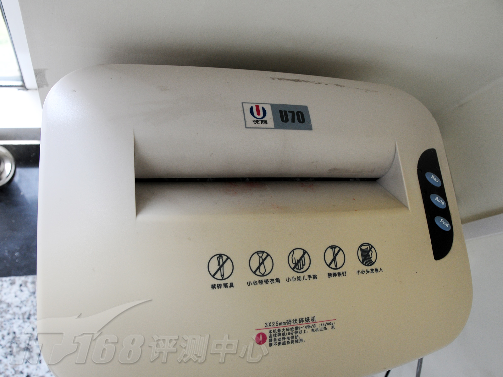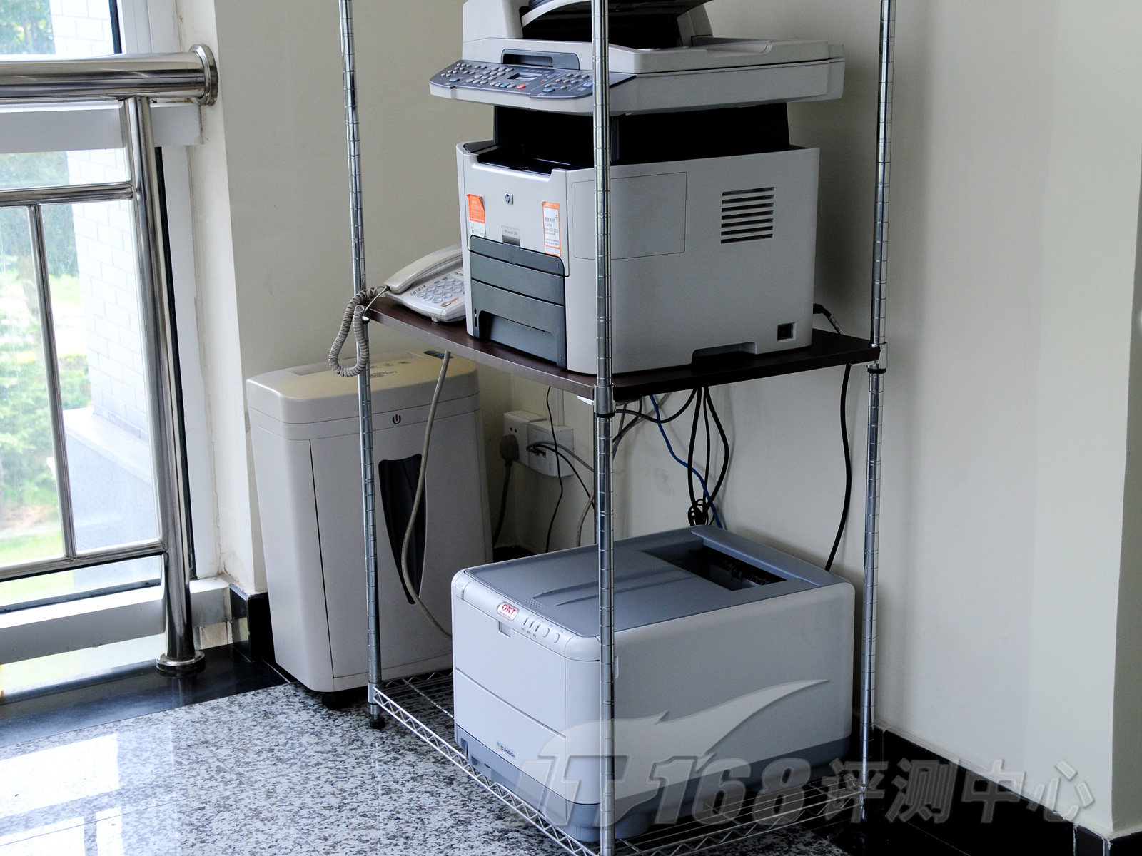 在打印机的侧面是一台优牌U70碎纸机,碎纸能力3x25mm,可同时处理9-10页A4纸。目前市场售价在600元左右,主要用来对传真接收和发送的保密文件的销毁工作,这在研究所等机构是非常重要的办公设备。