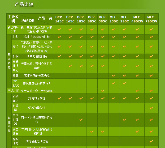 兄弟DCP系列产品型号丰富,市场价格低于千元的产品共有585CW、385C、185C、165C、155C、145C、350C,另外还有部分产品已经下市,在此不再赘述。从命名方式可以看出,这些产品的性能和配置呈阶段性上升的趋势,从而让各个层面的用户都可以获得更加舒适贴合的使用体验。其中,DCP-585CW是推出不久的一款机型,在低端的机型中加入了无限网络单元,对于以笔记本为主要办公工具的环境来说更加适用。而新推出的DCP-165C,官方报价在899元,目前市场售价稳定在690元左右,在商用机型中属于价格最低的产品。