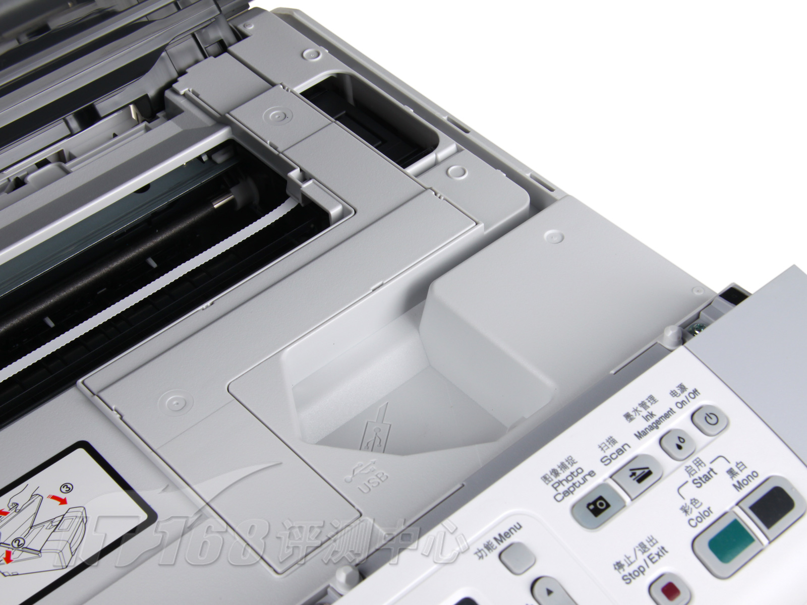 DCP-165C采用兄弟独特的USB接口设计,隐藏在机身内部,打开上盖才能进行插拔。隐藏式的设计有助于保护接口,同时避免了桌面布线的凌乱,使一体机能够适应更多窄小拥挤的办公空间。在机身的正面,支持CF、SD、XD和MS四种存储卡或记忆棒,同时支持PictBridge直接打印模式。兄弟DCP-165C采用固定墨盒,移动打印头的打印模式,打印头和墨盒之间采用软管连接,无需打开机身盖即可进行墨盒的更换。在低端彩喷产品中,兄弟的墨盒容量很大,同时分体式墨盒的设计有效保障打印成本的降低。