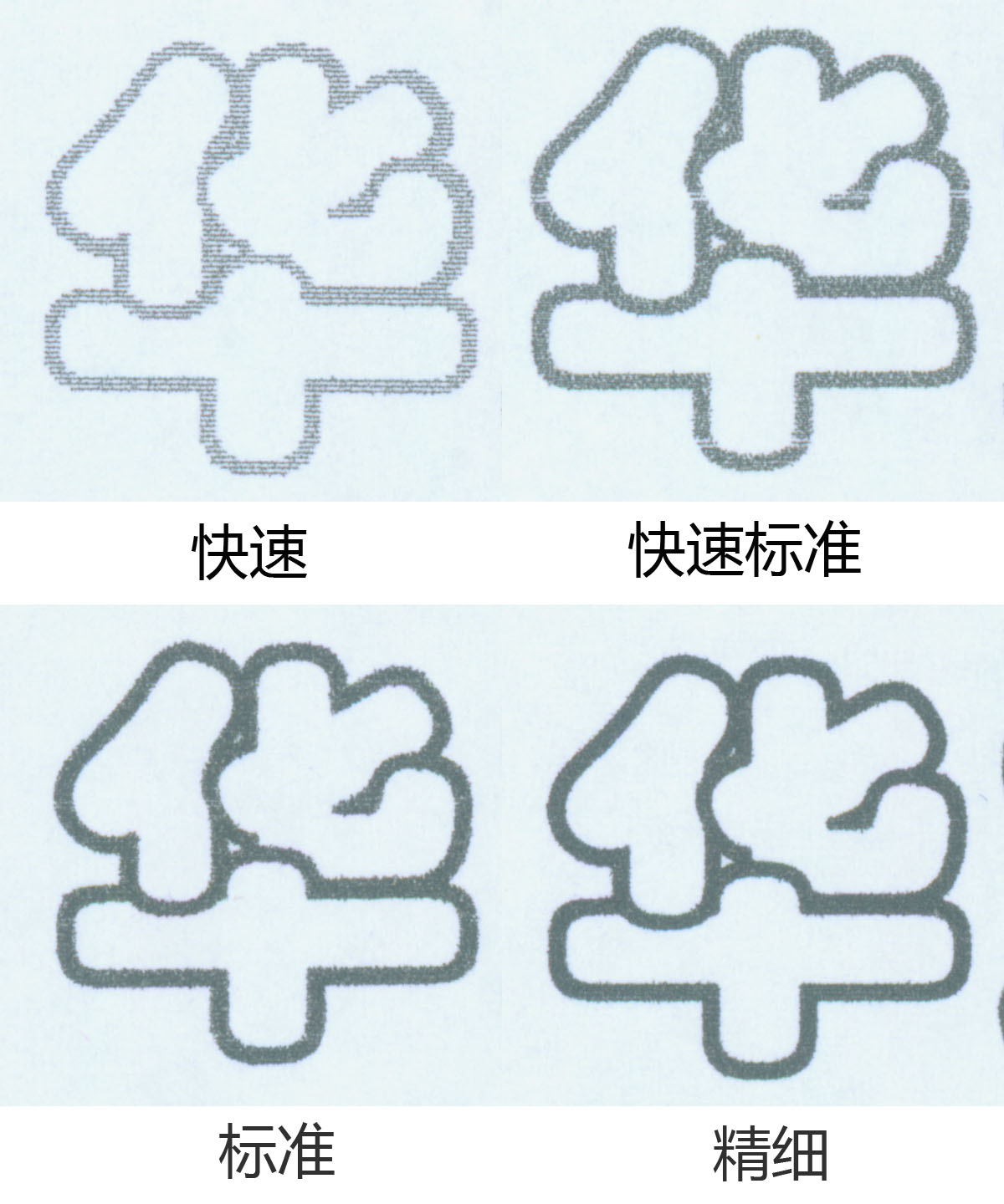 从文本表现上看,快速模式的墨滴浓度比较浅,同时采用隔行打印的方式,这对于墨水的节省有很好的效果,但是对整体文本来说并不十分清晰,甚至会出现漏打的情况;快速标准模式可以比较清晰的显示字迹了,相比于正常模式,快速标准也是通过降低打印分辨率来达到省墨和加速的目的。不同字号的字体表现中,兄弟DCP-165C可以清晰识别到2号字体,1.5号以下字体笔画粘连比较严重,已经无法辨识。华文彩云的字体表现中,字体笔画比较流畅,但边缘还有有比较明显的毛刺。