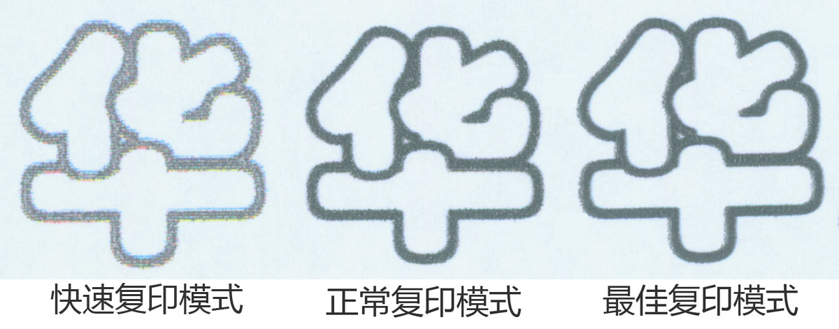 复印也有三种模式可供选择:快速、正常和非常好的,由于又可以采用彩色复印和黑白复印两种方式,所以排列之后有多种的组合方式。从复印效果来看,正常模式的复印效果基本能够还原原稿的效果,只是在边缘出现了一些飞溅的墨滴和分层,这种情况在非常好的模式可以被很好的控制,而快速模式则基本可以反应字体,只是在小字体方面有些不够清晰。
