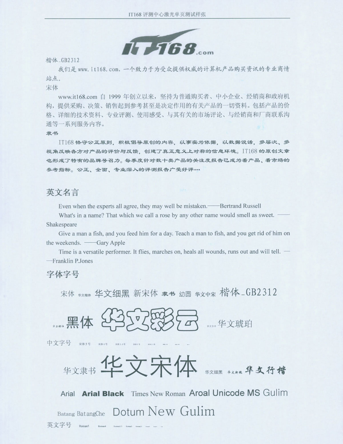 MFC-7450的文本输出能力出色,从整体上看,样张字迹清晰有力,给人的视觉冲击力强劲。对于不同字体的表现,MFC-7450可以清晰打印1.5号字体,笔画清晰,基本没有缺失和粘连的现象。在华文彩云的字体表现中,曲线之处圆润平滑,肉眼基本看不出毛刺和墨粉飞溅的现象。在华文楷体的字体表现中,墨迹填充均匀,笔画比较连贯。