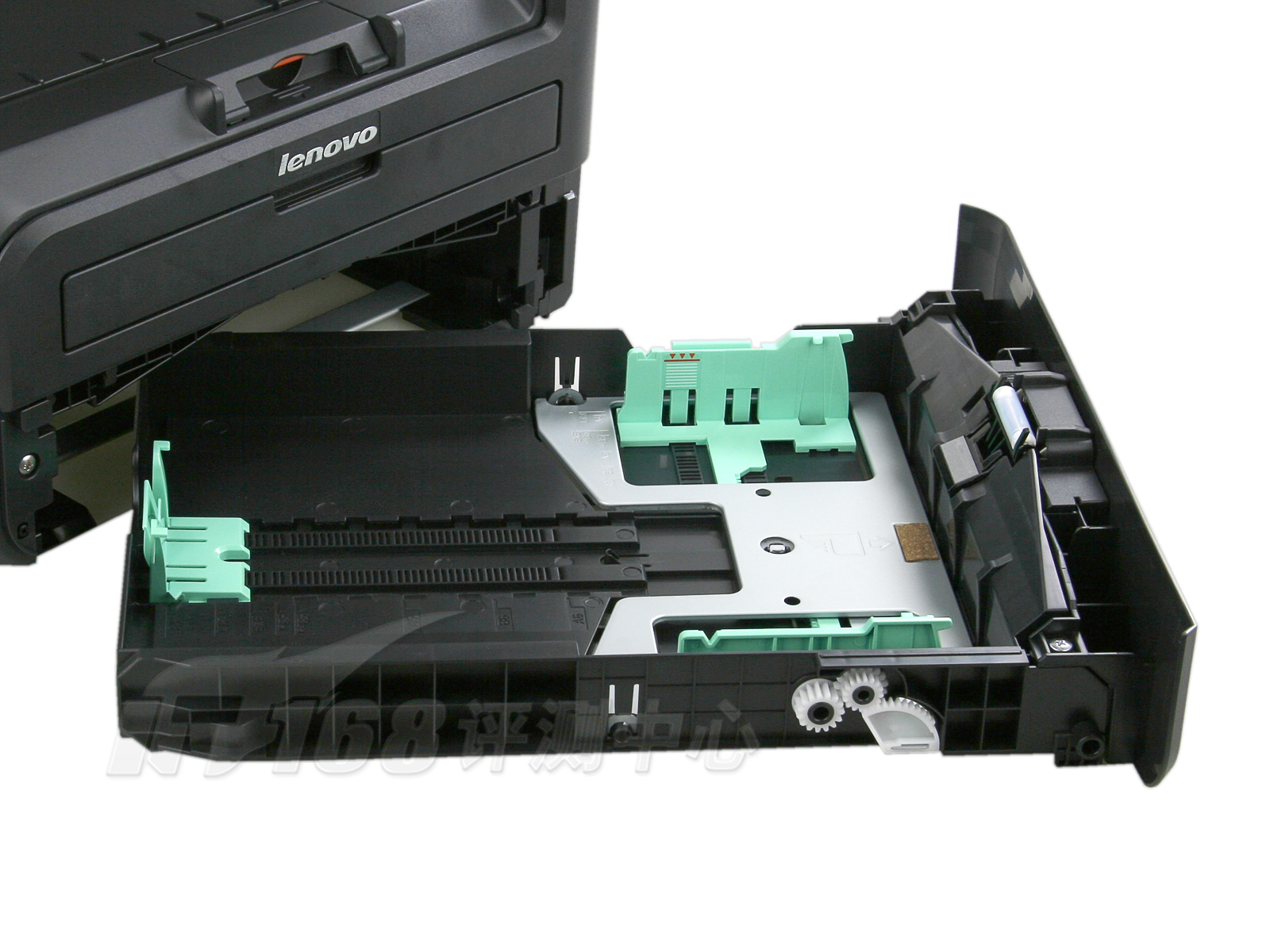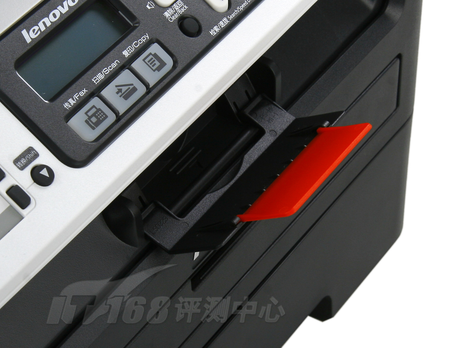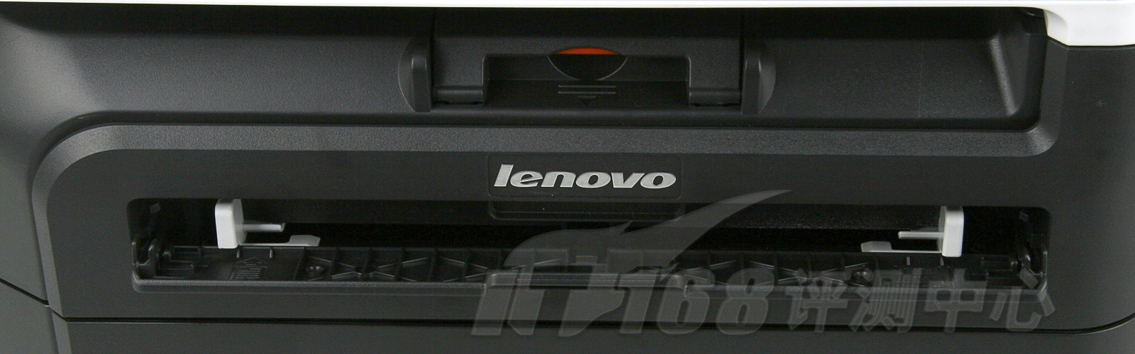 正面底部是联想M7260的抽屉式自动进纸盒,可容纳250页普通纸,换纸时,可以从机身拉出,纸盒三面都有卡夹帮助固定介质,防止在打印时发生卡纸的状况,在正面中间是联想M7260的单页手动进纸器单元,无法使用进纸盒自动进纸的介质都可以在此输入,不过挡板材质选择较为薄弱。进纸器与进纸盒的搭配,可以同时进行大容量普通纸输出与单页特殊介质输出,避免了频繁拉出进纸盒更换介质,使用较为方便。出纸单元向上45度扬起,可以有效避免介质滑落,顶端的红色比较抢眼,为沉闷的办公环境增加了一丝活力。
