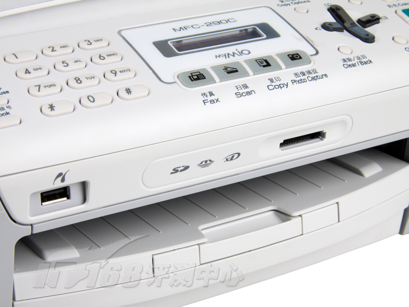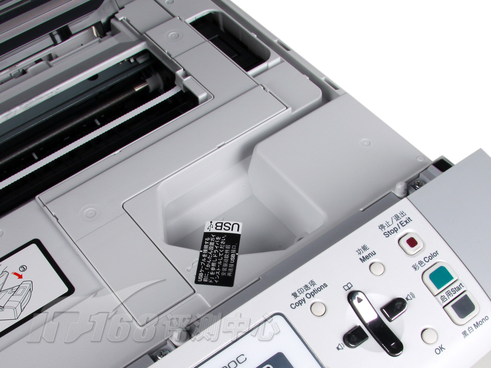 在机身前侧可以看到一体机的存储卡槽部分,对于市面上的主流存储卡都可以支持,同时MFC-250C提供PictBridge接口,支持数码相机直连打印等功能,为家庭用户提供了更多便利。MFC-250C的USB接口与其他机型一样,采用隐藏式设计,位于机身内部,通过独有的凹槽走线,这些细节设计都使得机身更加轻薄。
