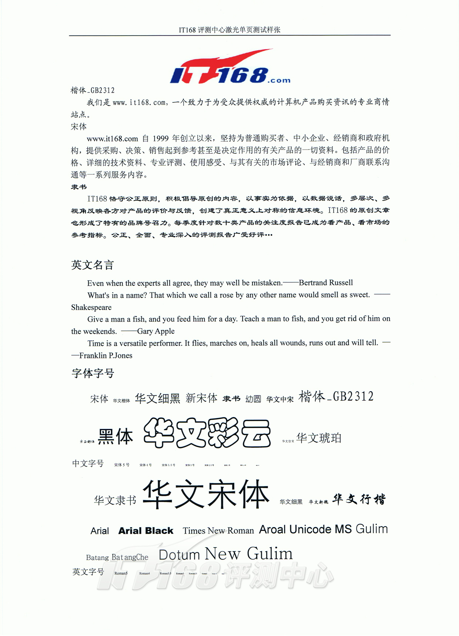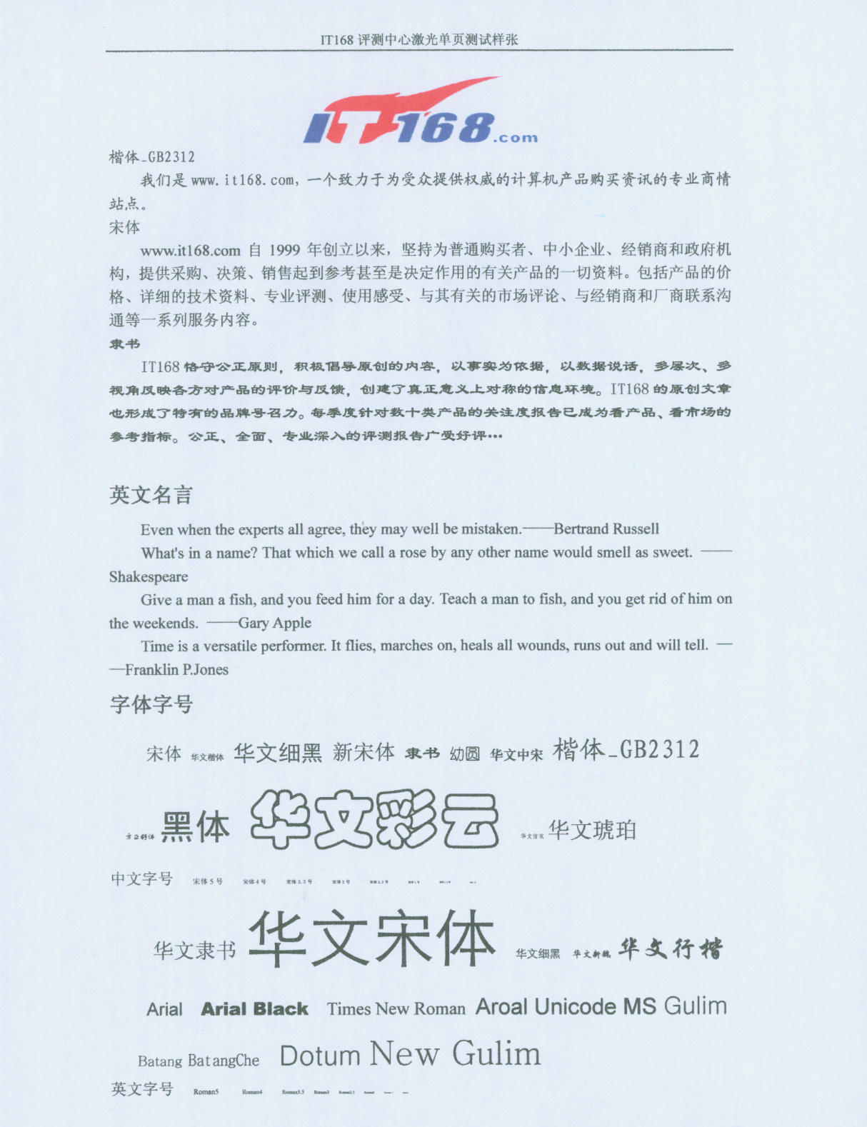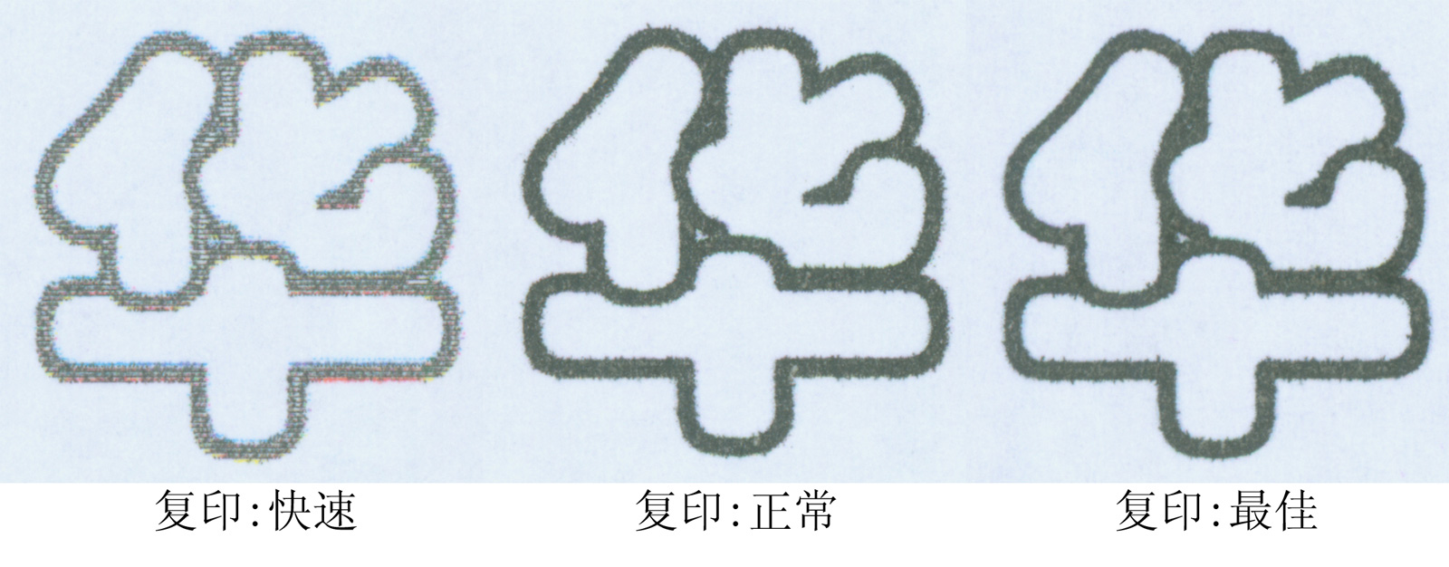 复印也有三种模式可供选择:快速、正常和非常好的,由于又可以采用彩色复印和黑白复印两种方式,所以排列之后有多种的组合方式。从复印效果来看,正常模式的复印效果基本能够还原原稿的效果,只是在边缘出现了一些飞溅的墨滴和分层,这种情况在非常好的模式可以被很好的控制,而快速模式则基本可以反应字体,只是在小字体方面有些不够清晰。