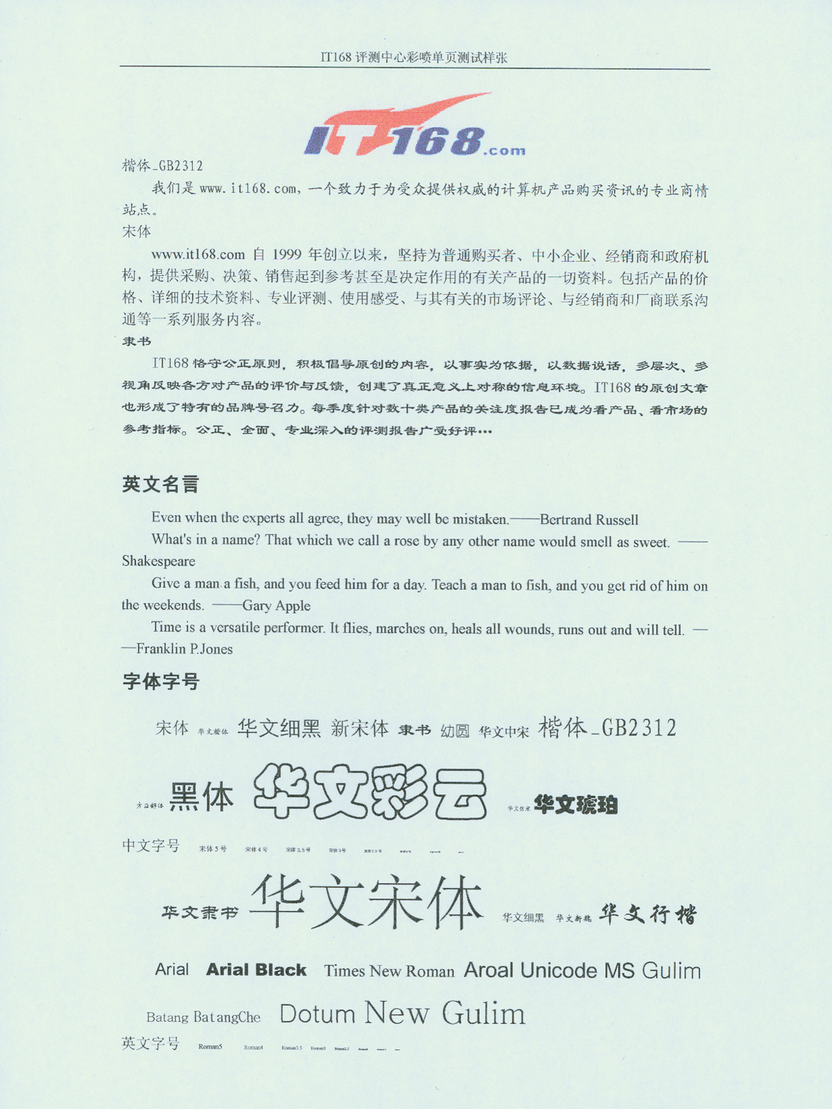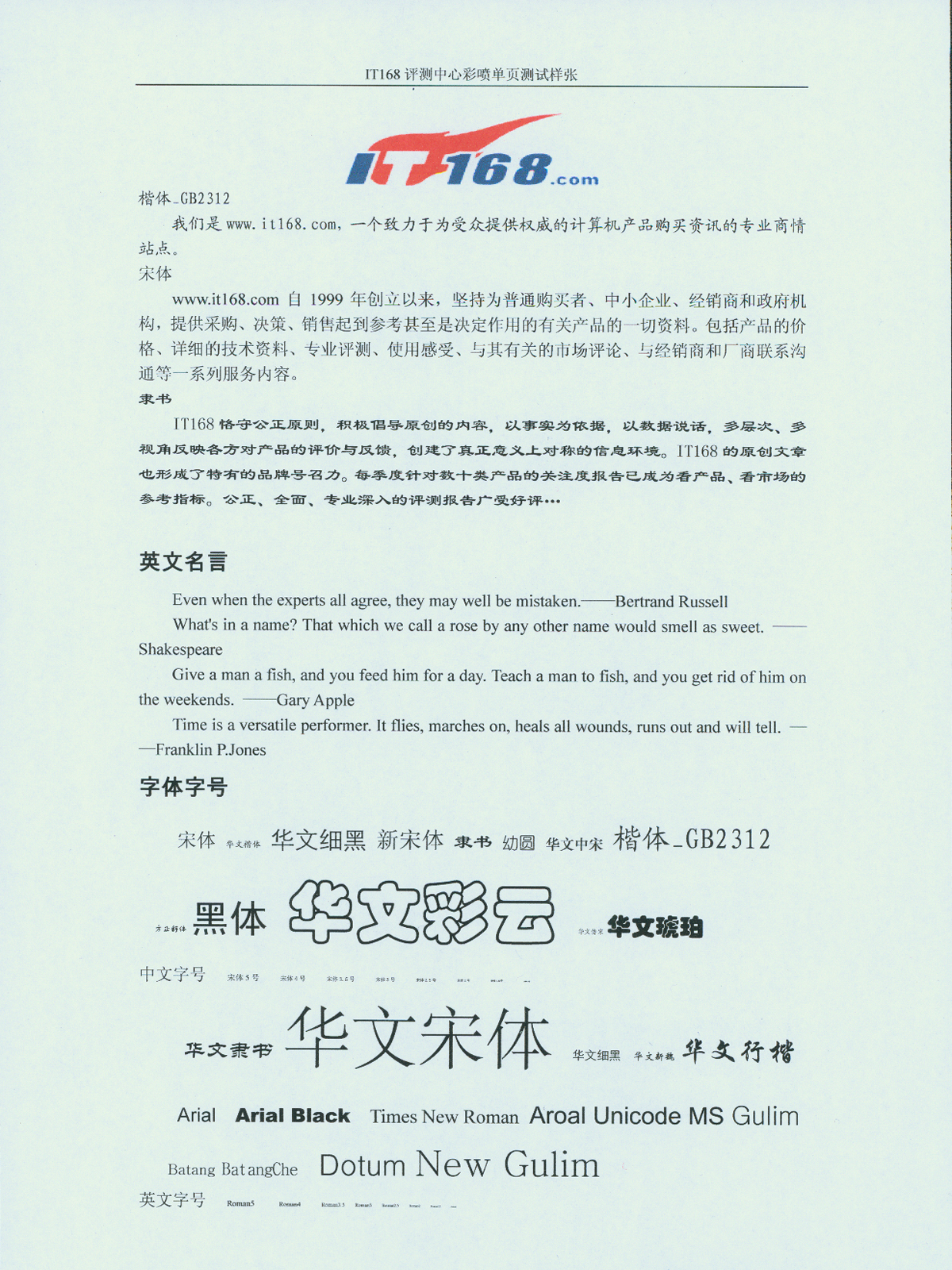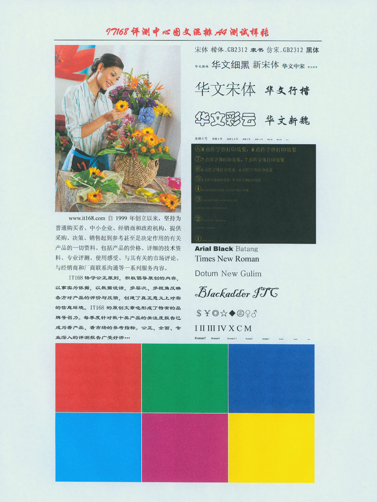 从文本打印效果来看,惠普C309g的表现卓越,具体表现在整体黑度充足,字体清晰有力,笔画锐利,没有断裂和粘连等问题,比前代产品有了一定的进步。在“比草稿快”模式下,字迹已经非常清晰,只是在黑度方面略显不足,但是在日常办公等应用中,使用这种模式已经足够。惠普C309g的图像输出效果比较出色,但是对于暗处的细节有一定的缺失。