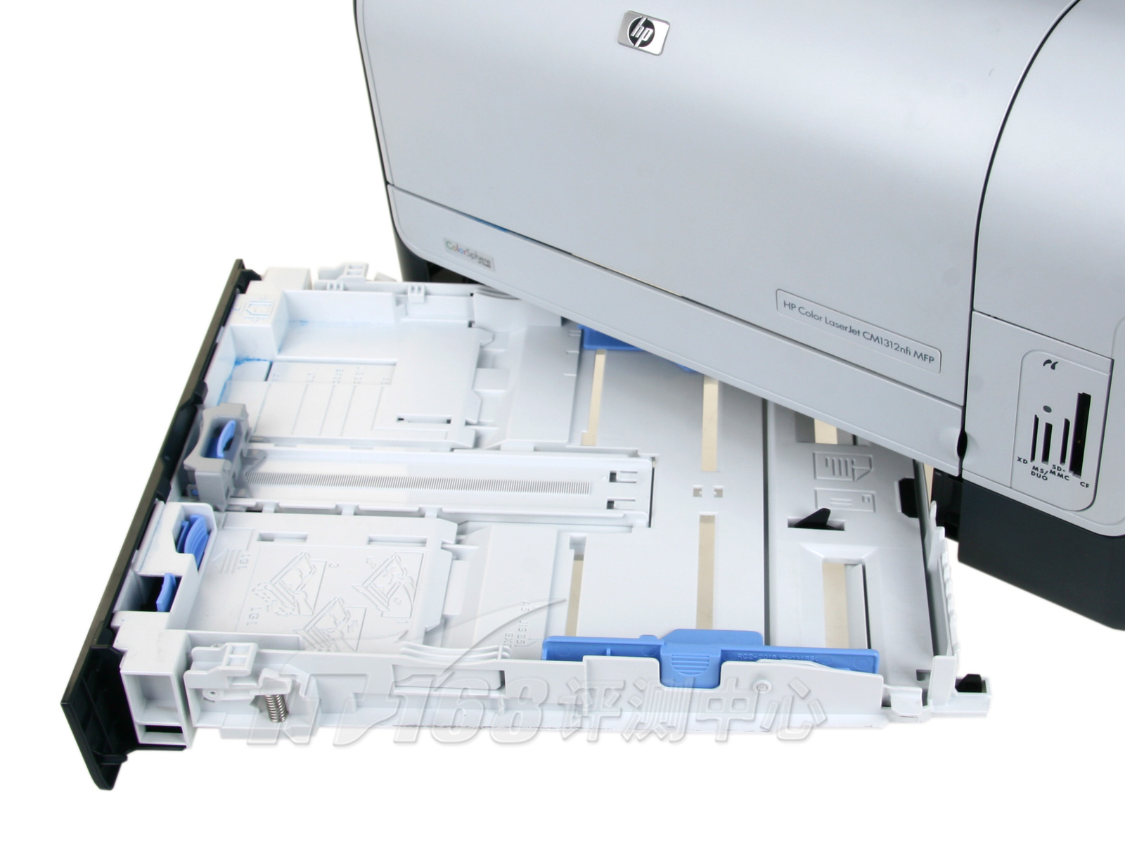 HP CM1312采用底部进纸、中部出纸、顶部扫描的走纸方式,底部自动进纸盒采用抽屉式设计,可以抽出机身进行换纸操作,便于对齐纸张以免发生卡纸、倾斜等问题,自动进纸盒容量为150页,略微偏小,出纸托盘容量为125页。HP CM1312采用惠普“水平式”一次成像技术,正面检修门设计让一体机的维护更便捷,打开前仓盖后可以拉出硒鼓托架,鼓粉一体式耗材设计让普通用户也可以轻松进行维护与更换操作。CM1312随机附带体验型硒鼓,容量约为标准硒鼓的1/3左右,需要注意的是体验硒鼓不支持灌粉操作。CM1312采用惠普CB540A-CB543A系列硒鼓,标准黑白硒鼓寿命约2200页,彩色硒鼓寿命约1500页,随机耗材容量在750页左右。