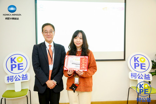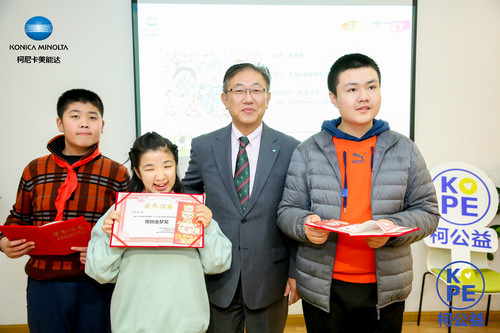 柯尼卡美能达办公系统(中国)有限公司董事长炭谷忠彦(居中)为一等奖获得者颁奖