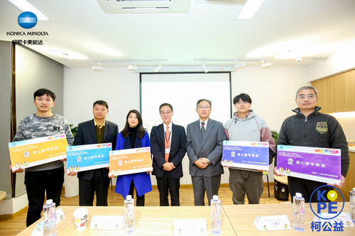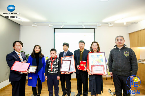 柯尼卡美能达办公系统(中国)有限公司董事长炭谷忠彦(左一)为一等奖作品指导老师颁奖