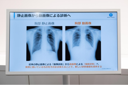 柯尼卡美能达八王子技术研发中心讲解人员平井桂先生为我们展示了不少柯尼卡美能达的最新科研成果。如柯尼卡美能达暗盒式数码X光摄影装置AeroDR fine,其拥有x光线曝光量少、高精度数字化且即刻成像的特点,进而提升诊断的精确度,减轻患者的负担。而在实际应用案例中,柯尼卡美能达数字X光视频成像系统,可以实现胸部x光检查的动画成像,从而帮助医疗人员发现病人肺部不易发现的问题,早发现早治疗,提升诊断水平。