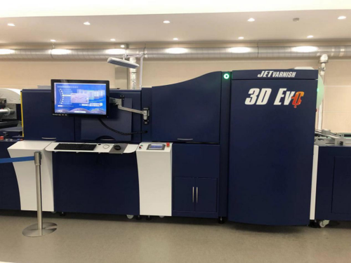 此外,笔者一行还看到了另外一款重磅产品MGI JETVARNISH 3D EVOLUTION,它可通过100%数字化工作流程实现局部上光与烫金印刷,无需传统的丝网版、锌板或是铜板等模具和板材,只需要在CMYK打印文件之外准备一个专色图层,即可完成少至一张,多至数千张的打印作业,大大缩短打印准备周期和节省高昂的板材费用。