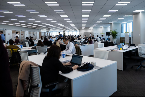 柯尼卡美能达日本总部位于JP Tower的14层,乘坐电梯经过前台后,便进入柯尼卡美能达总部办公室。因为正值工作时间,办公室呈现了十分忙碌的一面。而有别于印象中的日本企业办公室布局,柯尼卡美能达办公室的一些变化引起了我们的注意。