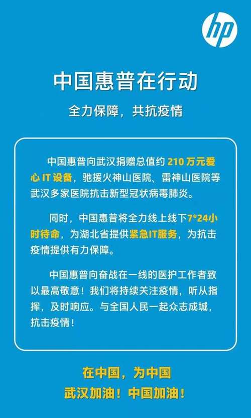自疫情爆发以来,中国惠普已积极组织内部各业务、服务及技术团队采取行动,启动高级别应急机制,疫情期间在线上为湖北省各地医院、防疫站及各种公共服务机构提供7*24小时技术咨询服务, 线下提供湖北省当地7*24小时上门工程师待命服务,保证能在线上线下第一时间响应、应对需求,全力保障湖北省境内各地医院、防疫站及各种公共服务机构的IT设备顺畅运转,为抗击疫情提供坚实有力的保障。