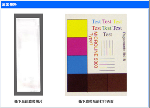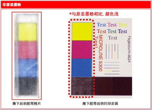 使用原装耗材打印出的内容,墨粉附着牢固、重叠保存效果优良。使用非原装耗材时,打印出的内容可能逐渐出现墨粉脱落,重叠保存时会因此发生相邻接触的纸张相互染色的情况。