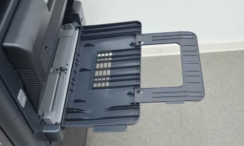 不仅如此,针对印量需求高的用户,该机还可选购大容量供纸系统。除了标配的350页容量纸盒外,该机还可以配置额外的纸盒,最大供纸量可以提升至1350页,为用户免去不断加纸的麻烦,进一步提升文件处理效率。此外,在机身右侧还配备了100页多功能进纸器,可满足用户打印不同规格的纸张文件。而此次我们评测的这款产品,还配备了下方工作底柜,方便用户存储纸张。