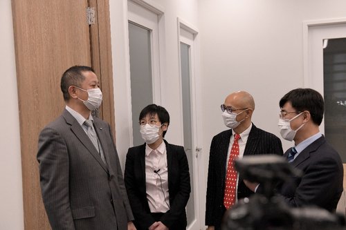 柯尼卡美能达钟登根副总经理(左一)欢迎受邀的经销商代表带领线上与会经销商开启“云参访”