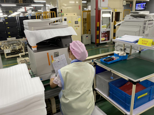 在复合机装配完成之后,还有专门的岗位对已装好的复合机进行检验测试,涵盖了产品外观、重点功能以及噪声、能耗方面的检测,确保每一台出厂的复合机都是高质量成品。