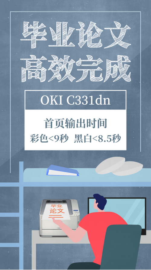 OKI C331dn配备的高速处理器和大内存缩短了首页输出时间,彩色首页输出时间小于9秒,黑白首页输出时间小于8.5秒,大大提高了论文的打印效率。