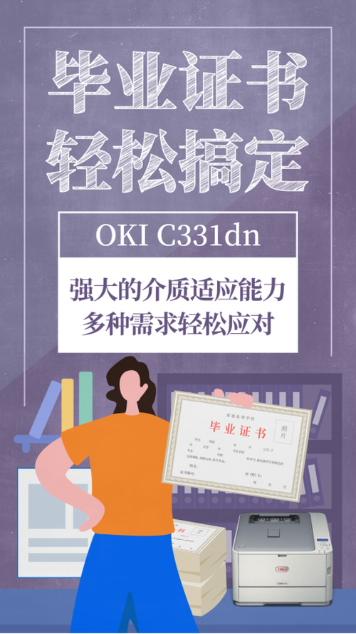 OKI C331dn强大的介质适应能力,可全面支持从A6到1320.8mm长幅的各尺寸介质打印,最厚支持220gsm纸张打印,全面满足各种毕业证书的打印需求。
