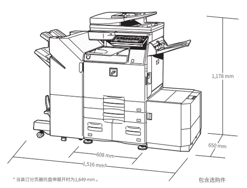 夏普MX-C4082R彩色复合机是在上一代C4081R基础上进行全新升级的产品。所以外观方面,该机沿用了之前的设计元素,黑白灰的混搭风格,更加符合商用环境使用。而为了满足用户不同的需求,该机设计有丰富的配件,如纸盒、分页器、装订器等等,可以满足不同用户的需求,而增加了配件的复合机会占用的更多的办公空间,用户在选购前要做好安置复合机的准备。