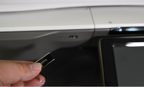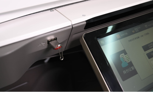 在触摸屏的左侧,该机还提供了前置式USB接口,用户可以直接将USB存储器插入复合机,LCD面板上就会自动跳出相关信息,用户不仅可以打印USB内存储的文件,还可以将扫描后的文件,一键保存到U盘上,操作非常便捷。