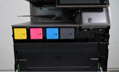 打开机身的前部面板,我们就可以看到该机的耗材舱部分,四色独立式墨粉盒,非常易于识别。据介绍,该墨粉使用了新一代超微细墨粉,相比与传统墨粉,具备低融点特性,使得定影过程能耗更低,可以为复合机节省跟过的能源消耗。而该机还使用了全新开发的带式定影系统,可以将复合机预热时间缩短为10秒以内,这些设计都有利于产品降低综合能效,对环境更友好。