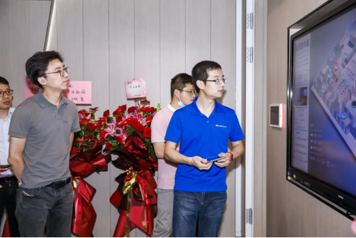 仪式结束后,受邀嘉宾们分组参观了崭新的办公室。前台映入眼帘的是一块newline智能交互平板,作为导览及互动使用。此屏可以和快思聪中控及预约平台对接,实时显示整个楼层各个会议室的状态,以及会议室主要功能,如:普通会议室,音频、视频会议室等。