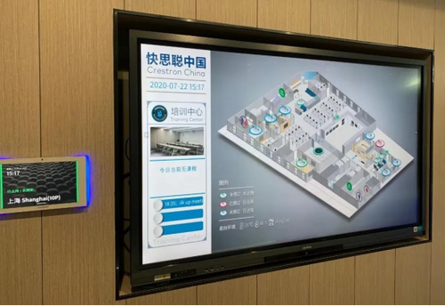 通过点击不同会议室,可获详尽清晰的路线指导,帮助与会者准确找到会议室;用户亦可以在屏上点击相应会议室图片,观看每个会议室的详细系统图;同时,可以通过扫描屏上二维码,轻松实现会议室预约。