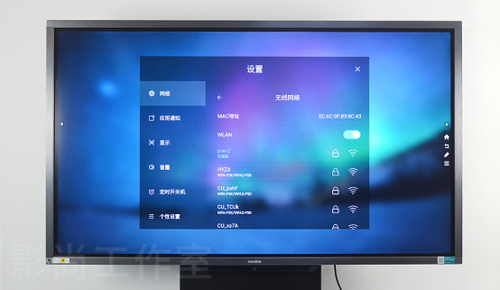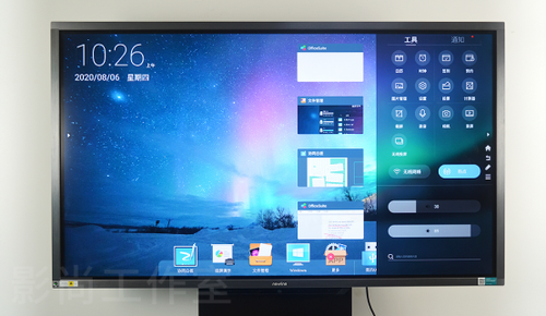 来到影尚工作室的65"锐系列会议平板配合支架,可以在会议室和评测室之间方便移动,使用时非常稳固