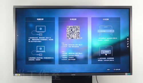 画面显示PC、iOS、安卓设备的无线投屏方式,提示用户操作