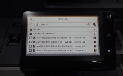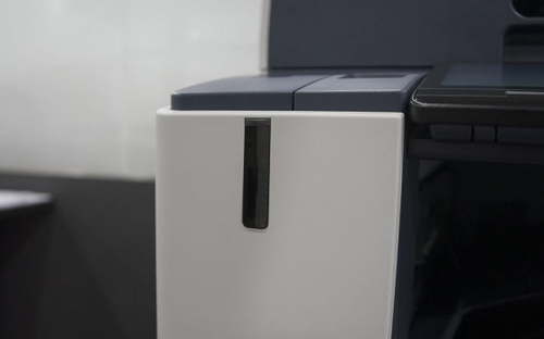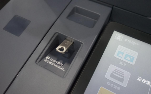 在触控面板的左侧,该机还配置有前置USB接口,用户可以在脱机情况下,使用移动存储设备完成在数码多功能机上的预览和打印或扫描到U盘操作,功能设计非常实用。通过实际使用体验,我们发现该功能响应迅速,可以较短时间内实现文档打印输出,对于提升日常文档处理能力,有非常大的帮助。