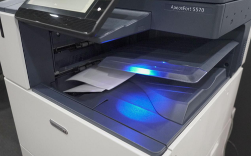 富士施乐ApeosPort 5570出纸口部分位于机器的中部,当打印操作时,出纸口部分配有的传感器,会启动蓝色柔和的指示灯,打印完成后一段时间内,该指示灯还会点亮,提示用户尽快取走打印件,这样的设计不仅十分贴心,还能够有效减少打印件泄密的问题,可谓一举多得。