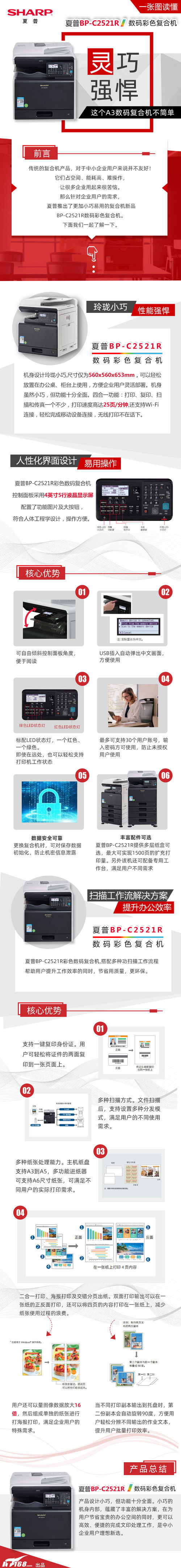 简单来说,夏普BP-C2521R产品设计小巧,功能设计全面。其小巧的机身内部,蕴藏了丰富的解决方案,在为企业用户节省宝贵的办公空间的同时,更可以轻松应对和完成复杂的文印处理工作,这才是中小企业用户的理想新选。如果您对该机还有那些需要进一步了解地方,可以通过下面的一张图解读,来更详细的了解该机情况,也希望你能选购到合适的复合机产品。