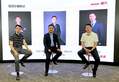 发布会现场,柯尼卡美能达DEVELOP德凡销售部部长杨浩勇先生与经销商代表深圳精确信息技术有限公司总经理樊杰先生、南京佳之杰数码办公设备有限公司总经理陈熠先生、就租赁抄表服务、企业转型升级等话行业痛点开展了深入探讨。