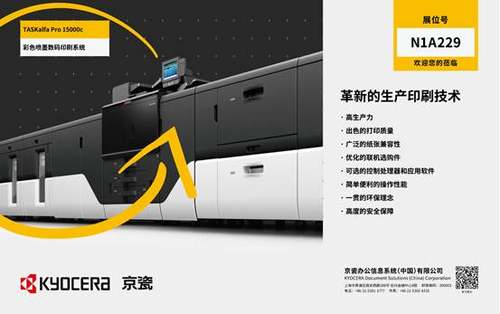 全球领先的打印设备品牌—京瓷也将在本届全印展上震撼亮相,凭借革命性的技术及全方位增值解决方案,京瓷将为用户带来前所未有的新体验。此次京瓷展台将设在上海新国际博览中心的N1A229展位。京瓷将借助本届全印展将全面展示TASKalfa Pro系列生产型彩色喷墨数码印刷系统新品及相关配套设备。观众可在现场第一时间感受来自京瓷的创新服务理念。