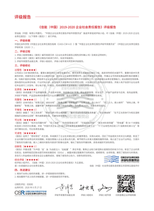 《报告》连续第五年获评中国社科院企业社会责任报告评级专家委员会较高级别五星级的评价,并在2020年企业社会责任优秀案例征集暨第四届CSR中国教育奖评选中荣获非常好的年度CSR品牌奖项。