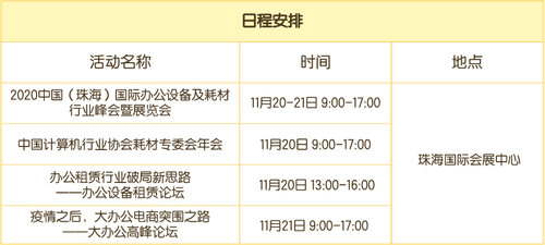 2020第十四届中国(珠海)国际办公设备及耗材展览会将于11月20-21日举办。今年,纳思达、汉光、拓佳、昱璟、黑木、傲威、旗捷、美佳音等打印复印耗材领军企业将参展,除此,奔图、汉印、普贴、普赢创新、玉樵夫、趣印等打印复印机品牌厂商将重磅进驻。
